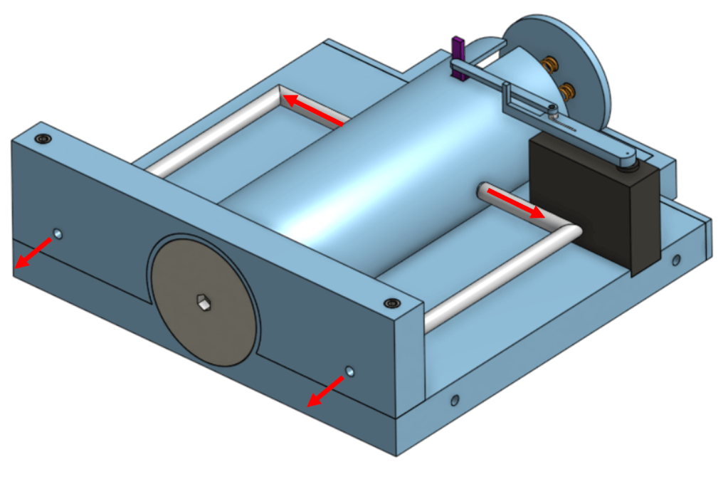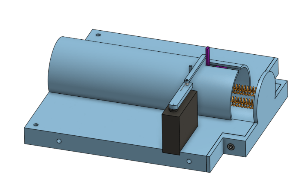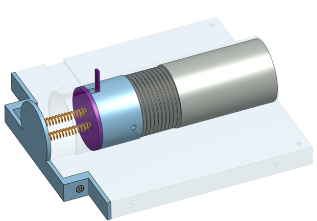 The release of gas is facilitated by the plunger being pulled back by a servo and then four springs snap the plunger back into the sealed position after the servo has succeeded in pulling back the plunger far enough for CO2 to have been released. Figure 11 depicts the assembly of the base (transparent), holder subassembly, puncture component, plunger, and spring mechanism. The spring mechanism consists of four springs and a side wall that is bolted into the base piece with two 3/8” long screws with #5-40 thread.