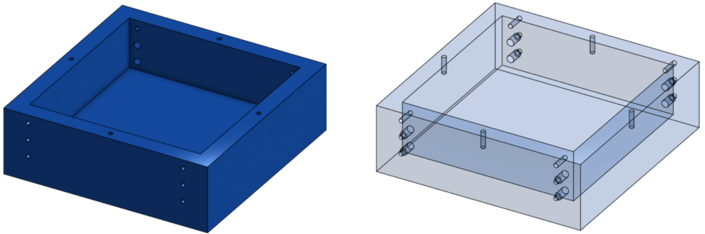 The housing for the electronic components, such as a power source and microcontrollers, of the new bug zapping design is pictured in Figure 24. The housing has a set of three holes near each corner (Fig. 25) for wire management and the attachment of supports. Four screw holes are located on the top plane of the housing for the housing cover (Fig. 26). The screws used to attach the supports and the cover are the same screw used in the CO2 dispersal subassembly, 3/8” long screws with #5-40 thread.