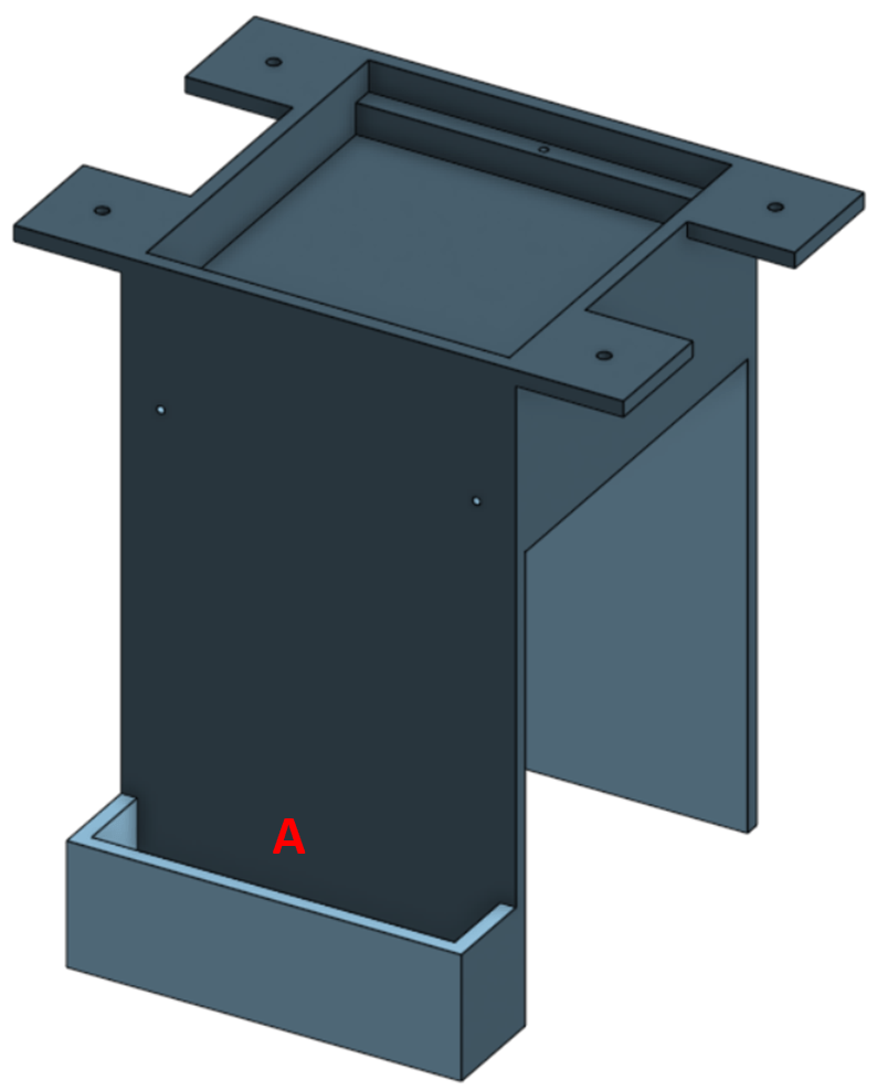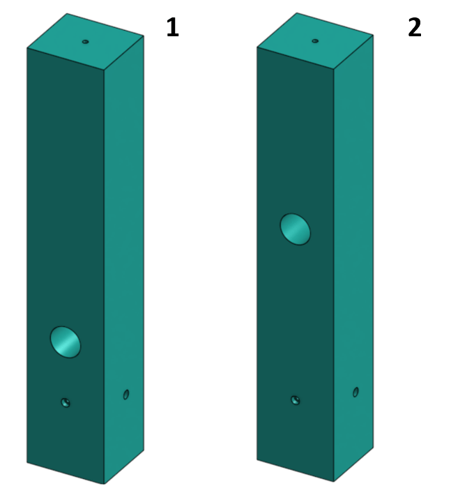 Covers were attached to the supports to enclose the wires leading from the dispersal assemblies to the electronic housing component. The covers attached to the foot of the supports with three screws, 3/8” long with #5-40 thread. Two separate cover designs were required to correspond to the varying height of the CO2 exit locations. The large holes found in the support designs to prevent blocking the release of CO2 were matched to hollow protruding cylinders in the support covers which allowed for the gas to flow through the hollow support assemblies. The two different cover designs are pictured below in Figure 29 and Figure 30.
