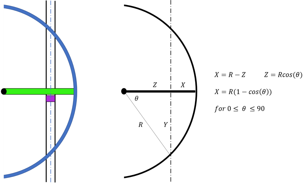 The switching of servo to spring power could have been accomplished by having the servo turn off after reaching the open position and allowing the springs to push the plunger back into the closed position. However, if this was done, the unpowered movement of the servo arm done by the springs could, over time, cause damage to the internal mechanisms of the servo. The solution for this was to use a servo arm of a specific length that, at a certain point of its rotation, swings off the plunger allowing the springs to push it back to the closed position. A simple diagram of this motion can be seen below in Figure 15. In order to determine the correct servo arm position, trigonometric equations (Fig. 15) were employed using the distance between the open and closed plunger locations. This distance was 0.25 inches. Using 0.25 for Y and a value of 2.60 inches for Z, which placed the pivot point of the arm 0,25 inches from the base edge, R and X were solved to equal 2.612 and 0.012 inches respectively. The X value corresponds to the amount the servo arm extends beyond the middle of the plunger. The middle of the plunger was used for the calculations as it was thought that after the arm passes the springs could overpower the servo and move the plunger back into the closed position. Therefore, if the edge of the plunger tab was used as the end point of Z, the servo arm may not complete its arc of motion before the springs pushed the plunger back. This would result in a servo that cycled the plunger without it ever reaching the open position. However, since the middle of the plunger was used as the end point of Z, the servo arm will most likely have to rotate to an angle slightly greater than the 5.5 degrees θ equals. This will have to be fine tuned with a working prototype.