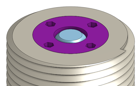 The design to secure the CO2 cartridge consists of a threaded cartridge pipe in which the cartridge fits and a threaded cap to lock the cannister in place while leaving the top open. Four 7/64 allen wrench holes for screwing in the threaded cap exist as well as a centered 7/64 allen wrench hole in the bottom of the threaded cartridge pipe to ensure a tight fit between the assembly within the dispersal device. A close-up view of the cap fitting into the cartridge pipe is seen below (Fig. 3).