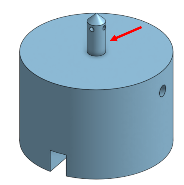 An important element of the CO2 dispersal design was to conceptualize a method to puncture the CO2 cartridge while also allowing for controlled release of the pressurized gas. The idea was to use a non-moving part that the cartridge was forced into, thus piercing it, when the C02 cartridge holder assembly was screwed into the bug zapper device. This part can be seen below in Figure 4. The tip of the hollow puncture component pierces the top of the CO2 cartridge. The bent CO2 cartridge casing at the puncture location should create a seal preventing gas from escaping the escaping. The only pathway then for the CO2 to travel is through the needle portion of the puncture component, which would be blocked at the moment of screwing the cartridge holder assembly into the dispersal device. If a seal is not formed at the puncture location, the diameter of the needle portion could be increased to a slightly larger size than the inside diameter of the CO2 cartridge tip. The walls would bend around the needle creating a tight seal.