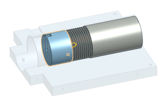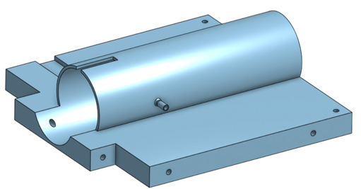 The base component of the dispersal device is where the various subassemblies and parts attach. Therefore, the design of the base is more complex than the other units involved. Images of the base can be seen in Figures 6 and 7 at different perspectives. The base’s middle is a cylinder to house the cartridge holder assembly and the puncture component. The puncture component is affixed in the cylinder and the holder assembly screws into the other side. Nozzles for gas distribution from the cartridge and puncture component are located on either side of the base cylinder. A representation of how the base, puncture component, and cartridge holder assembly interact can be seen in Figure 7 with the puncture component highlighted and the base made transparent for visibility.