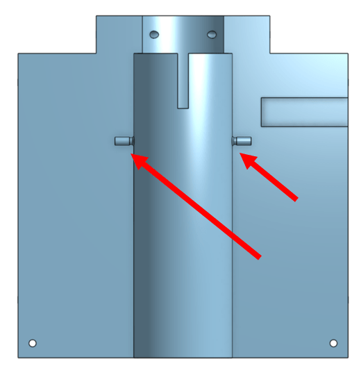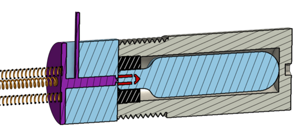 Figure 12 is a section view of the interaction of the plunger, puncture component, springs, and holder subassembly. It can be seen that the plunger seals off the flow of gas from the needle portion of the puncture component, pictured in red. In order for the air to be released, the plunger needs to be pulled back to allow for flow from the CO2 cartridge and out the nozzles on the base. A section view of the plunger being pulled back exposing the interior puncture component holes, which in turn line up to the nozzles on the base’s middle cylindrical portion. can be seen in Figure 13.