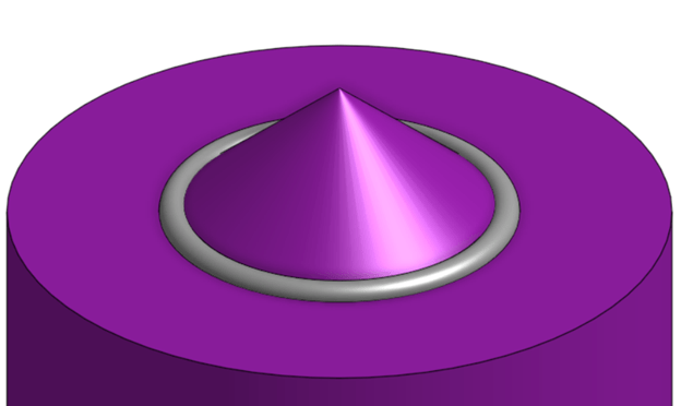The challenge of controlled release of CO2 was solved via a plunger and spring apparatus. The plunger (Fig.8) rides within the base’s cylindrical portion and slides into the hollow center of the puncture component which seals the off the opening to the CO2 cartridge through the use of a rubber O-ring. The O-ring’s outer diameter is 0.1018 inches, which, when pressed into the 3/32 inch opening to the needle portion of the puncture component, creates a seal preventing CO2 from being released. This seal is depicted in a section view of the plunger/puncture component interface in Figure 9. A closeup on the O-ring and plunger is shown in Figure 10.