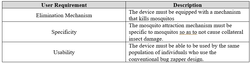 The following user requirements (Table 1). were created to home in on the specific needs that need to be addressed with a new bug zapper for use against the mosquito population.