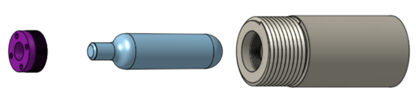 Using the dimensions of the CO2 cartridge shown above a cartridge holder assembly was designed to secure the cannister for controlled release of gas. The cartridge holder design, along with the CO2 cartridge, can be seen in the figure (Fig. 2) below.