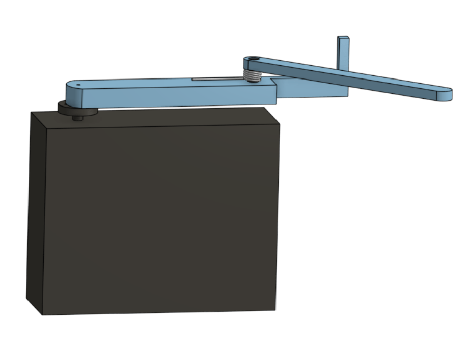 The servo arm is needed to be reset to its starting position when the plunger is closed as is illustrated by Figure 15. This could be done by having the servo arm rotate completely around; but this would increase the width of the device and be inelegant. A more sophisticated solution was to use a two-bar linkage system with a torsion spring for the servo arm that hinges in one direction, allowing for it to reverse its motion seen in Figure 15. This servo assembly is pictured in Figure 17. The servo arm two bar linkage is connected by a rivet which allows for rotation. The extending portion of the first bar prevents the second linkage bar from rotating counterclockwise while moving the plunger. The clockwise motion of the second bar allows for the servo arm to swing in reverse after moving the plunger (Fig. 18). Once the servo arm is past the plunger in its closed position the torsion spring realigns the second bar into position to move the plunger for another cycle. The servo assembly attached to the base assembly can be seen in Figure 19.