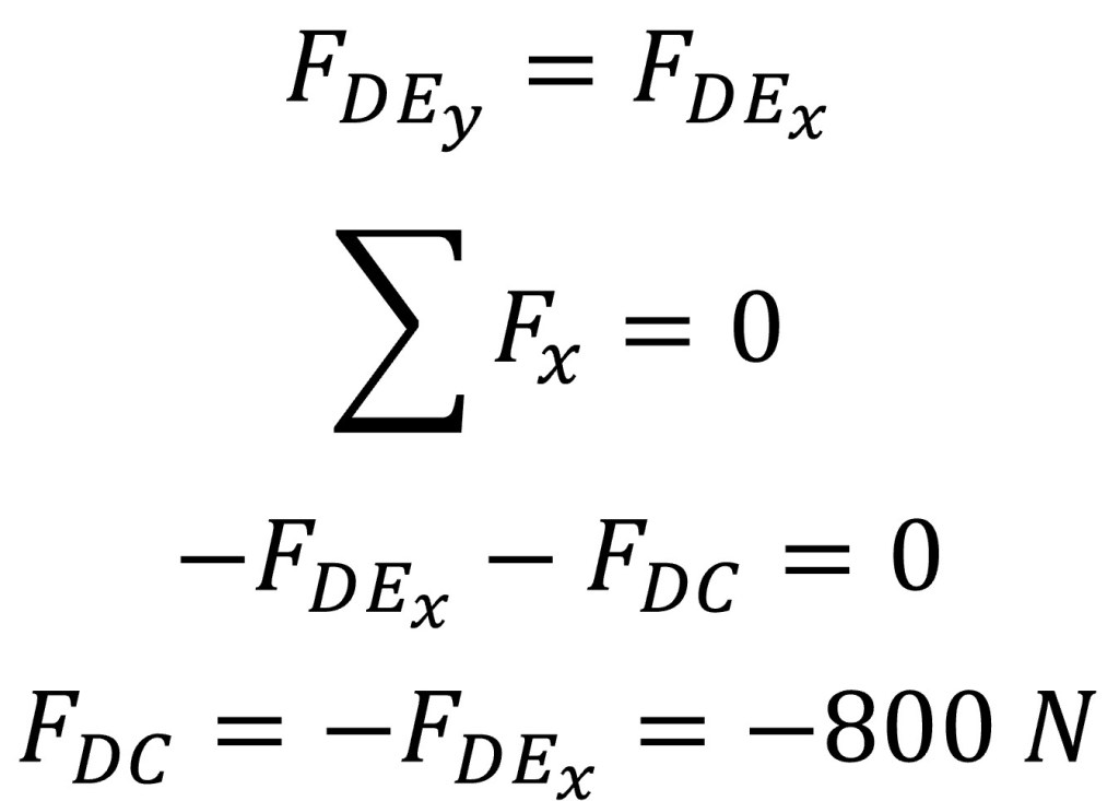 Knowing the trigonometric relation between the x and y-force components of the force found in truss DE and setting all the x-direction forces equal to zero, the force found in truss DC can be solved for by using the following.