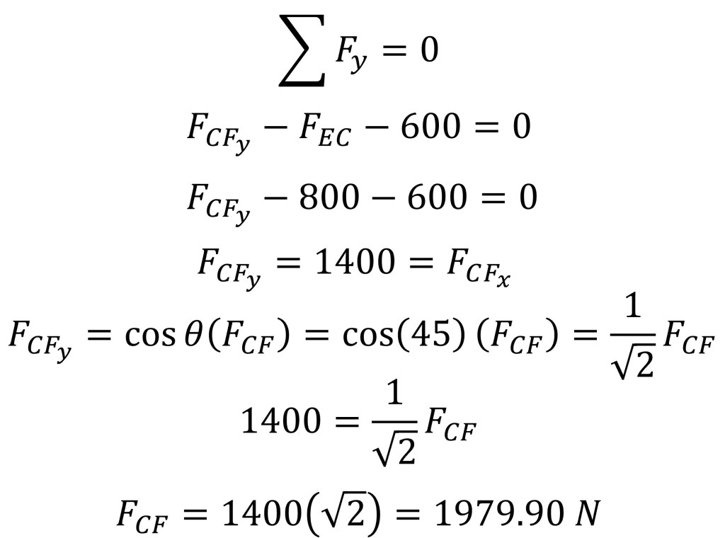 The forces in trusses DC and EC are known from the prior calculations. The first step with joint C is to set all the y-direction forces equal to zero and solve for the force in truss CF by first finding its y-component force. Once the y-component of the force in CF is known, trigonometry can be used to then find the force acting on the truss CF.