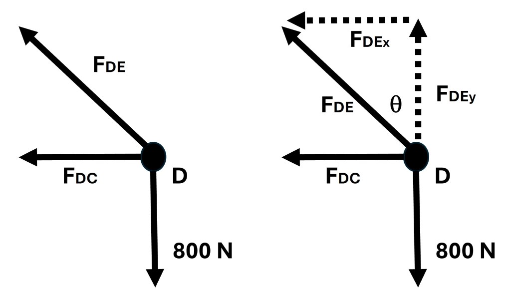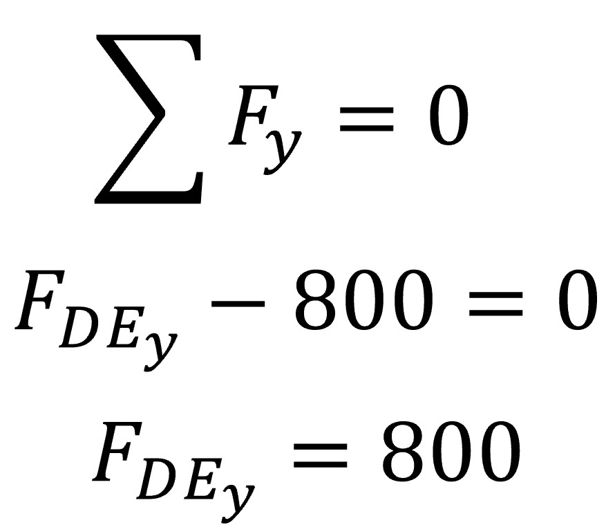 Step one in solving for the unknown forces at joint D is to use the equilibrium equation of setting all the y-direction forces equal to zero. This can be seen in the following series of equations along with the solution for the y-force component of the force found in truss DE.