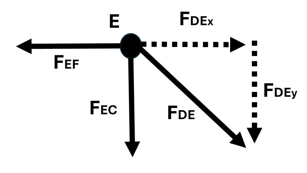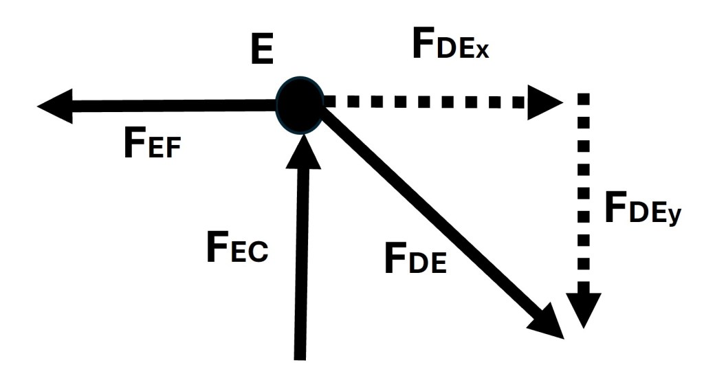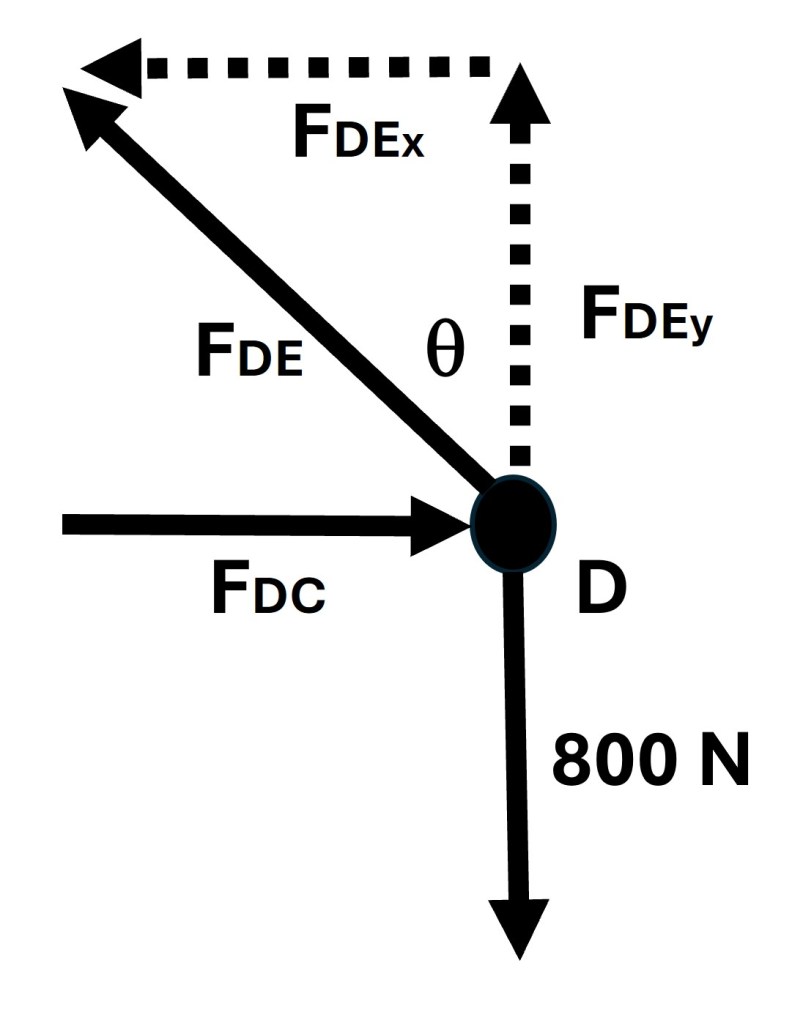 The next joint to isolate and solve is joint E. The free body diagram of joint E is pictured in Figure 4. Based on the work done for joint D some of the forces found in joint E’s free body diagram are known.