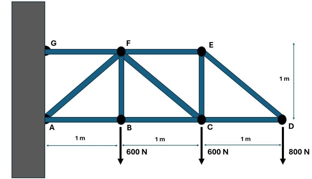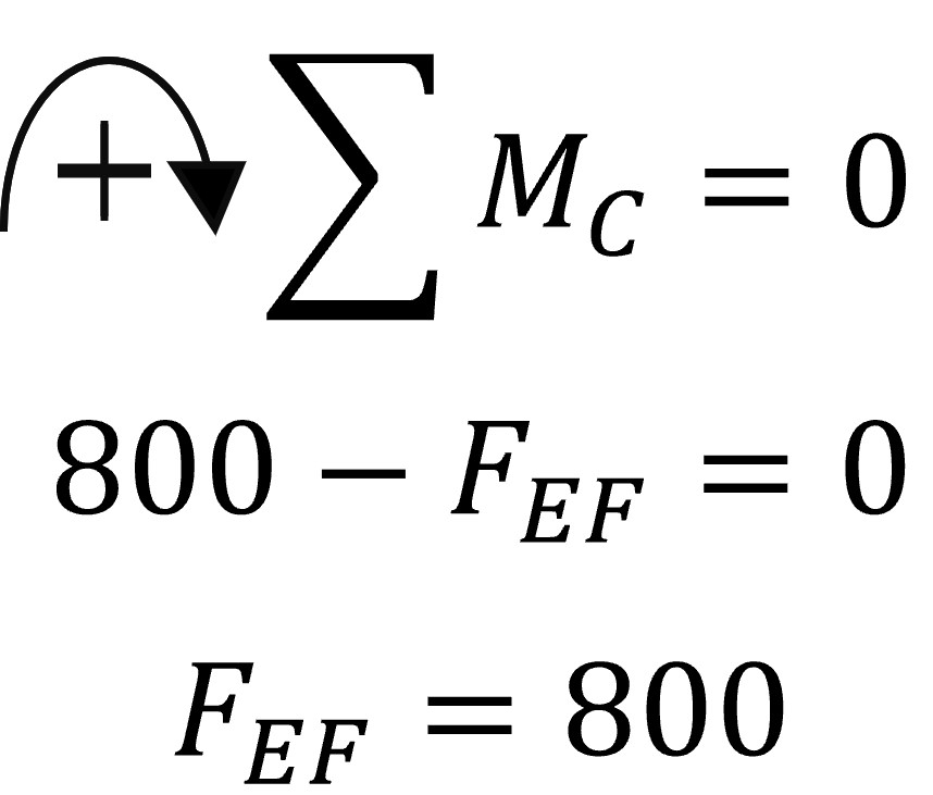 Taking the sum of moments around joint C and setting them equal to zero is a way to solve for the force in truss EF as the only two forces that apply a moment around joint C are the force in truss EF and the 800 N applied force to join D.