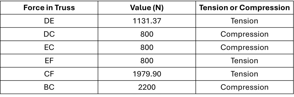 The direction of the arrow representing the force in truss BC shows that the truss is under compression. The below table summarizes the forces calculated by using the section method.