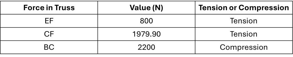 Since the value for the force found in truss CF is positive, we know the direction of the force shown in Figure 6 is correct and thus truss CF is in tension.